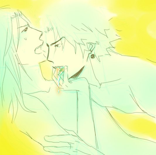 指舐め野生児とセクシーメガネ侍・・・? 最終回あたりになって三角関係とか急展開すぎるよ・・・!! あの小屋で二人いちゃいちゃおっぱじめればいいとずっと思っておりました。フウたんそっちのけ! この際宮本武蔵×ジンもアリだと!!! むっつりメガネ侍が乳首セクシー侍に昇格した記念に。 (乳首描いてないけど見える人には見える・・・といいね!)